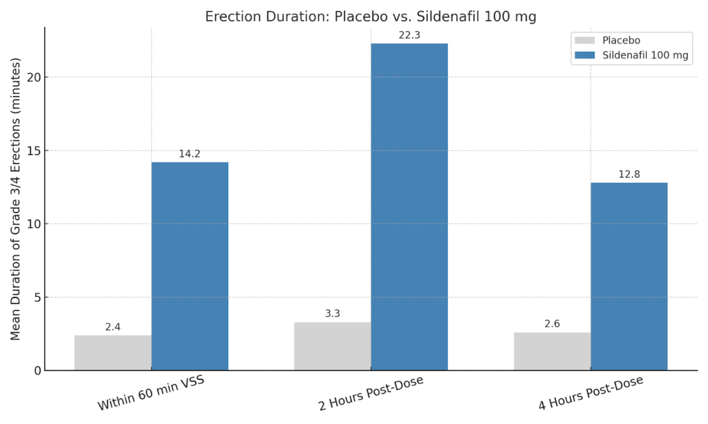 They also categorized erections into grade 3 – hard enough for penetration, and grade 4 – fully hard and noted their mean duration 1 hour, 2 hours and 4 hours post-dose. Their finding clearly depict that medicine is best absorbed and delivers the best quality erections within the first 2-3 hours. After this, you can still achieve firm erections, but they may not last as long.